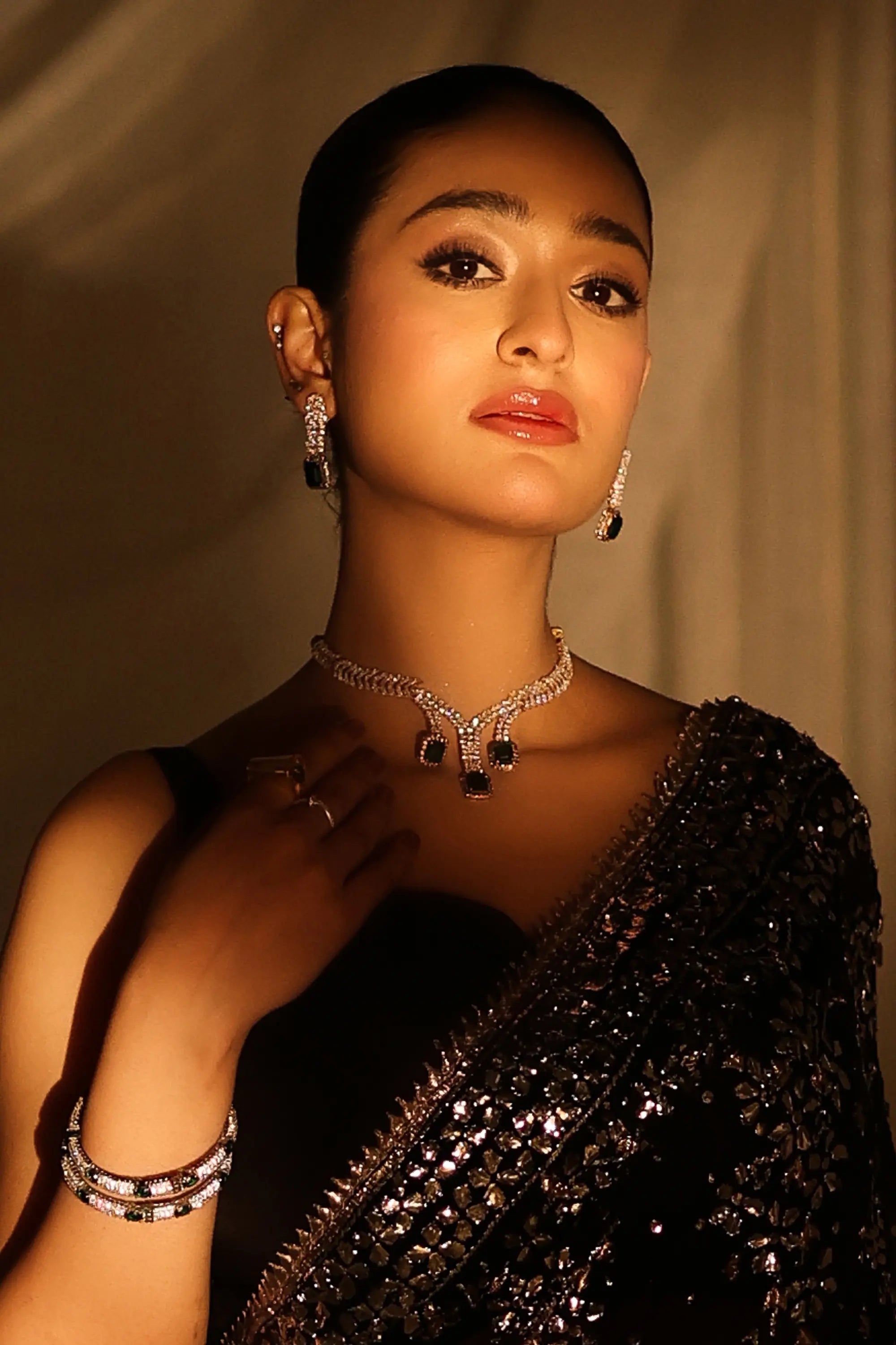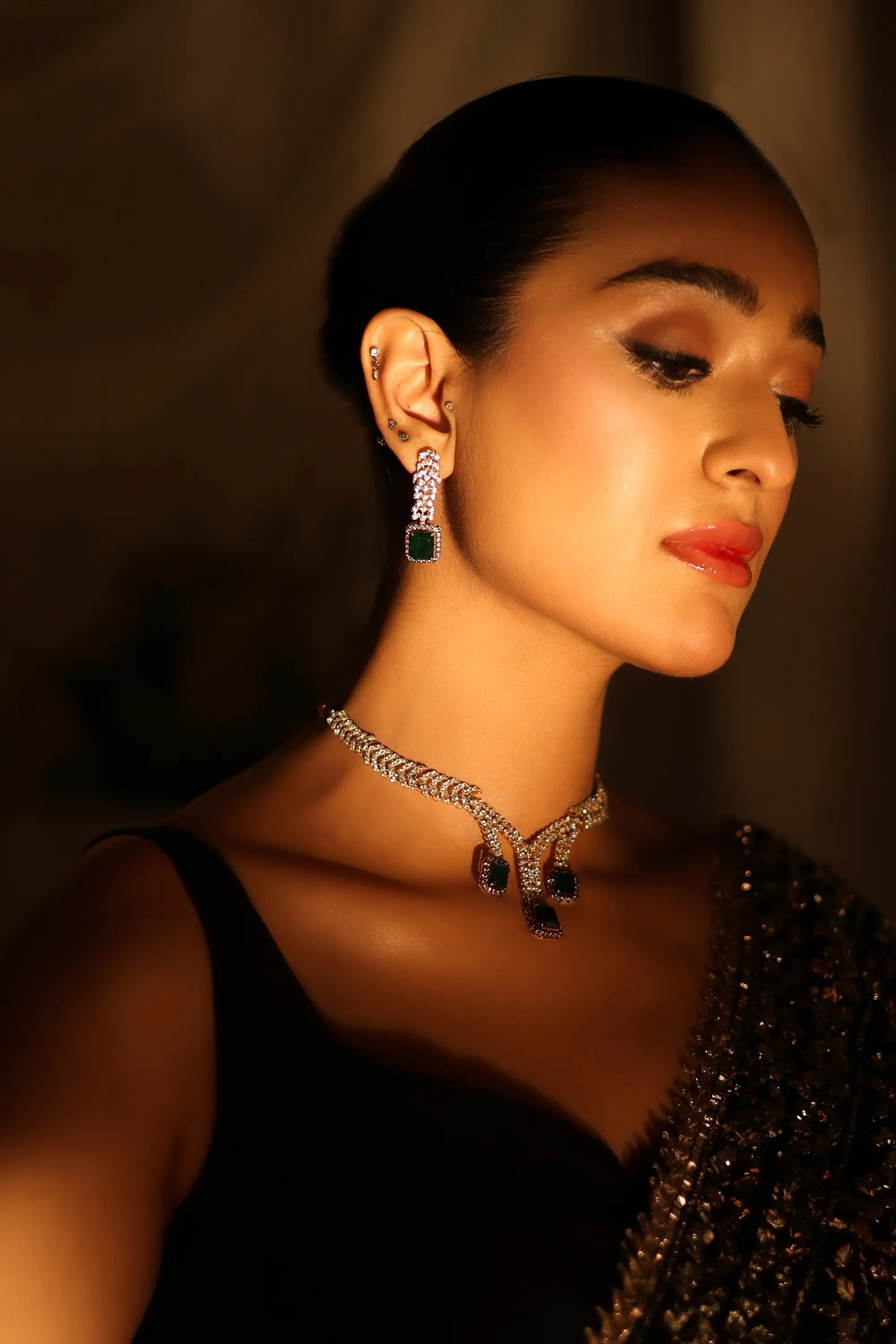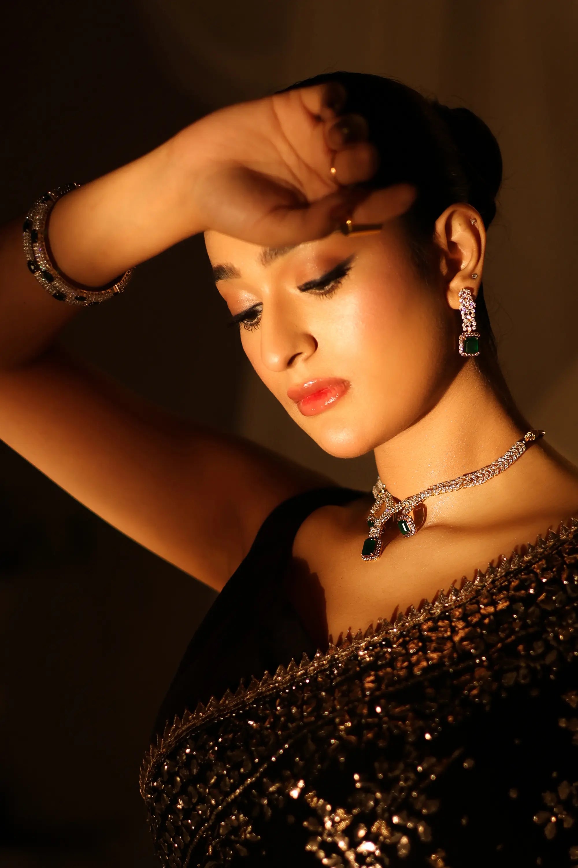 This set includes a sculpted choker-style necklace, matching earrings, bangles, and statement rings — each piece meticulously designed to exude class and individuality. The combination of silver brilliance and emerald tones makes Arora the perfect choice for festive soirées, weddings, or luxury evening wear.