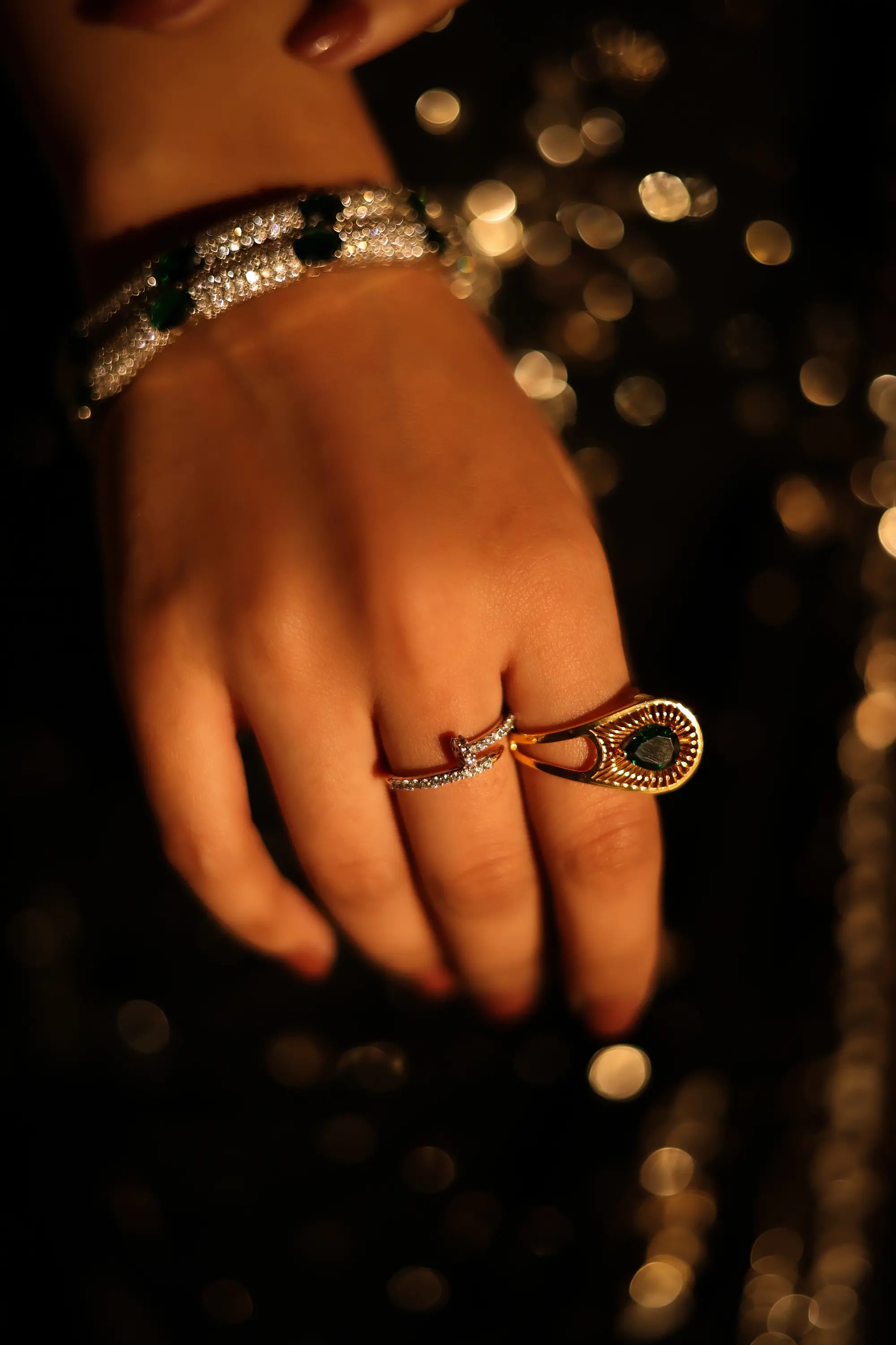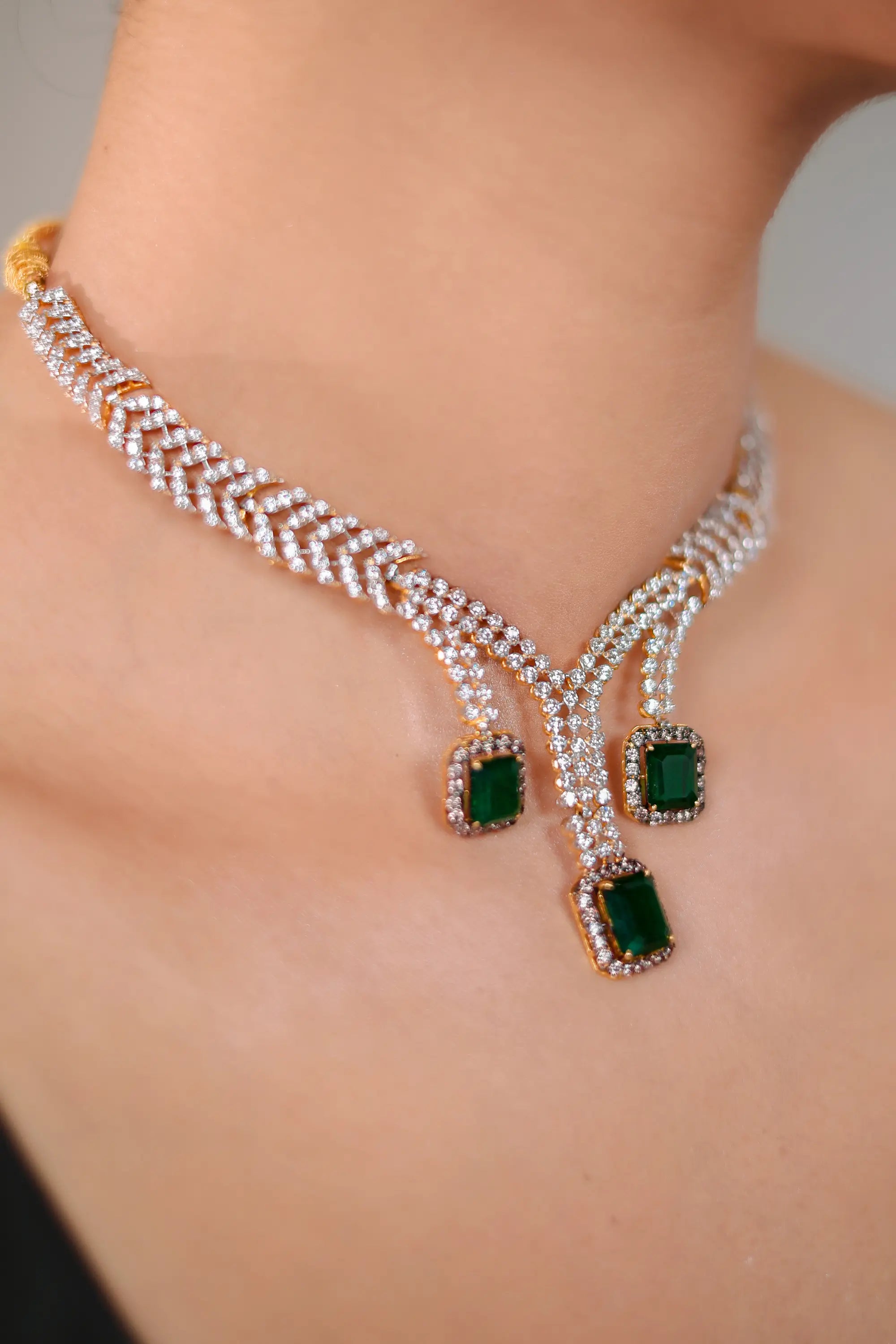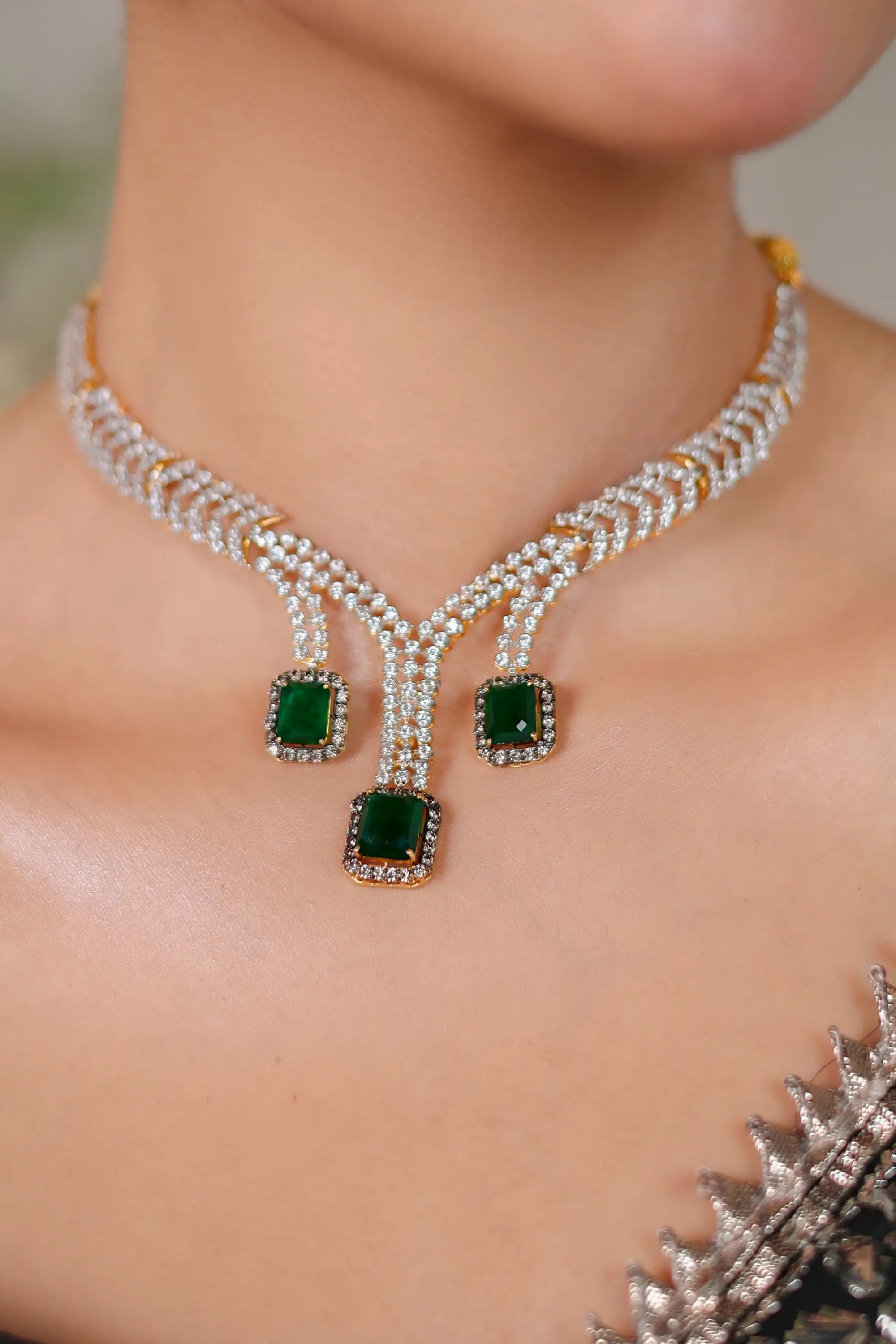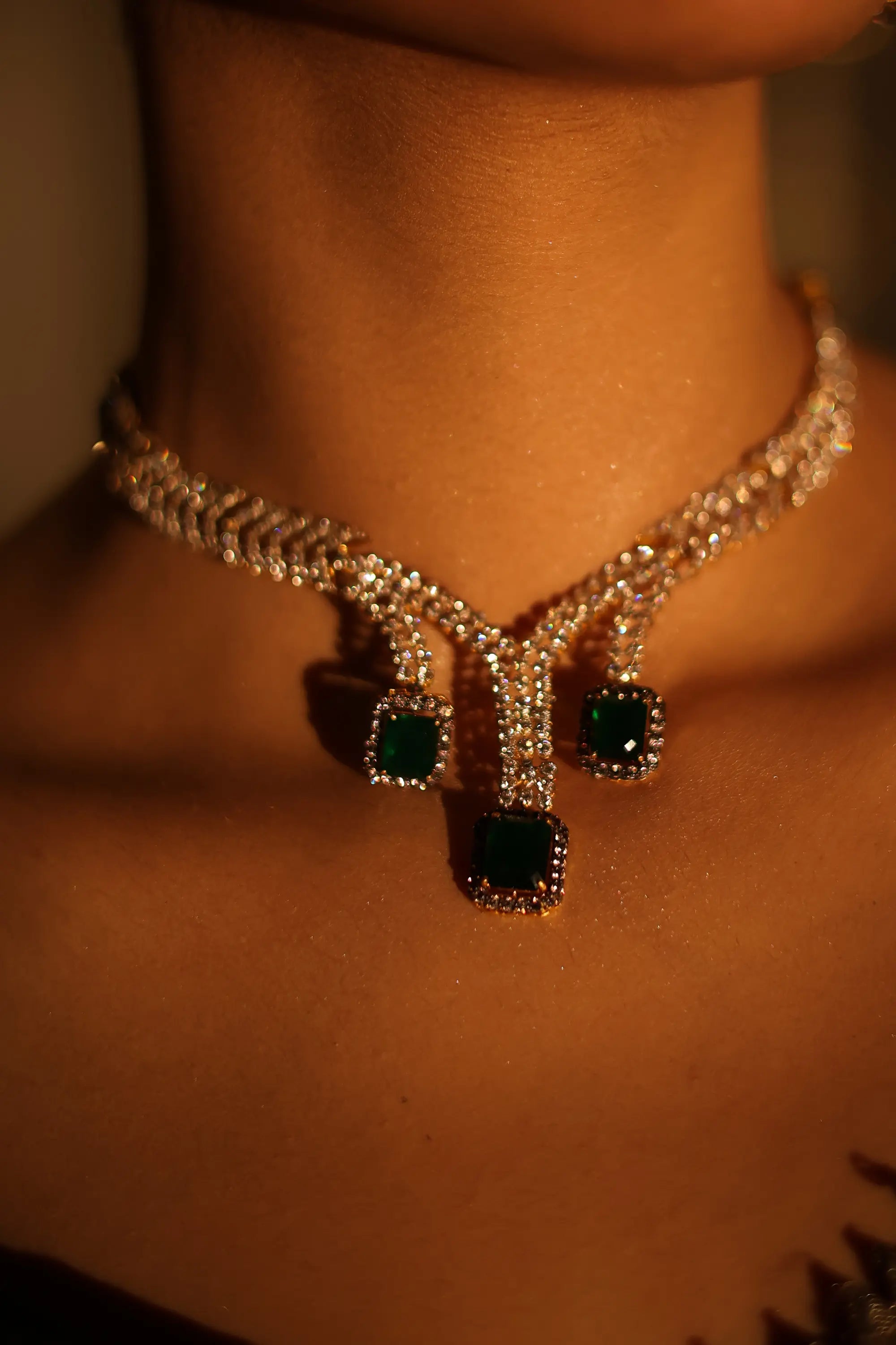 This set includes a sculpted choker-style necklace, matching earrings, bangles, and statement rings — each piece meticulously designed to exude class and individuality. The combination of silver brilliance and emerald tones makes Arora the perfect choice for festive soirées, weddings, or luxury evening wear.