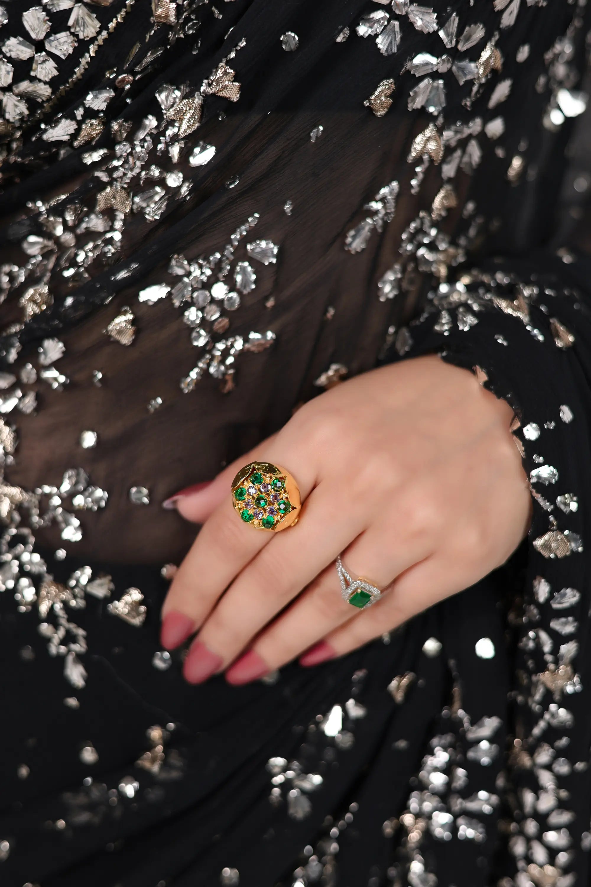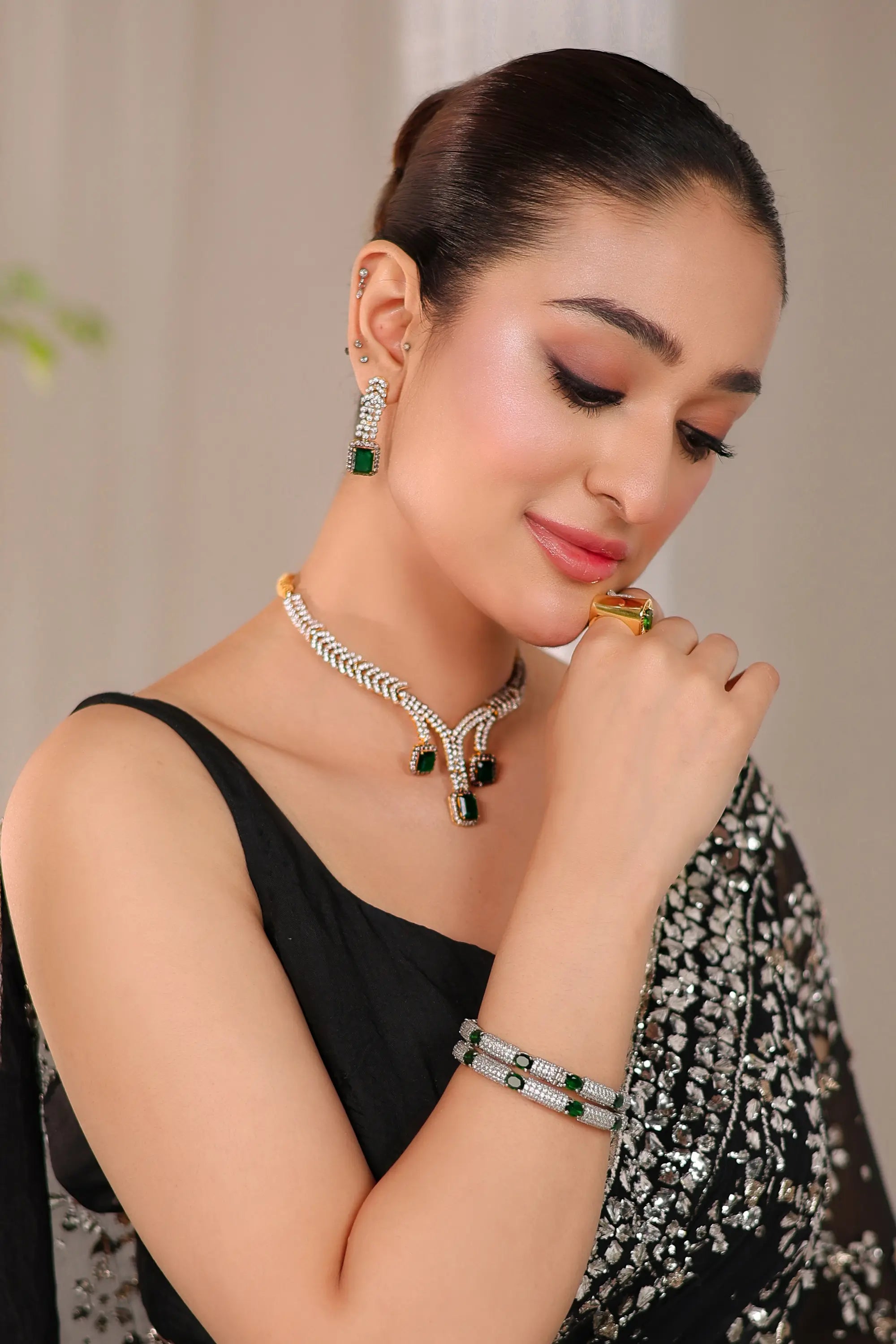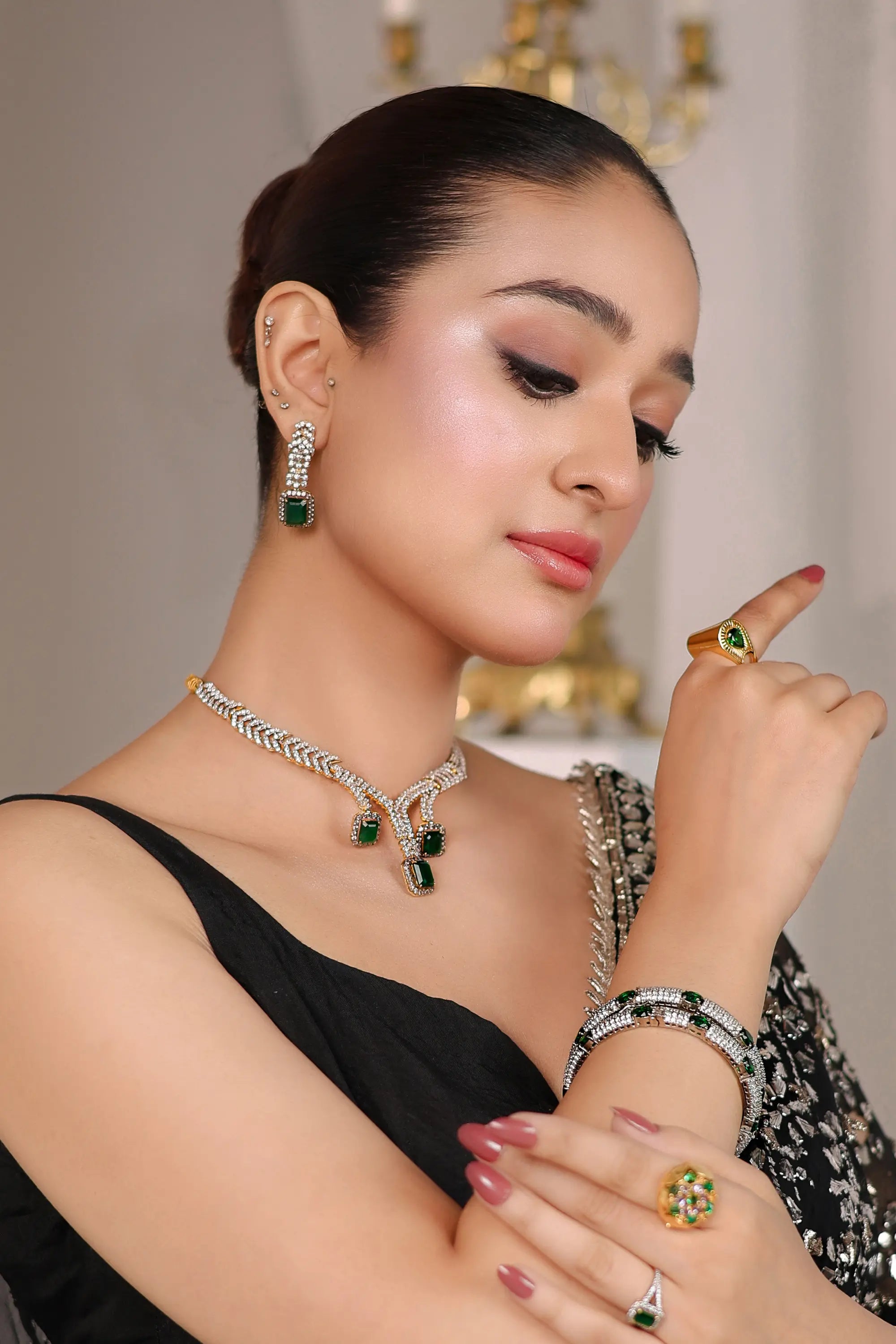 Bold yet breathtakingly elegant, the Arora Jewellery Set from Asim Qayyum Jewellers’ Diamora Collection redefines modern luxury with a touch of regal charm. Handcrafted in Gujranwala, Pakistan, Arora features rich emerald-green stones framed in dazzling crystal settings — symbolizing strength, beauty, and sophistication.