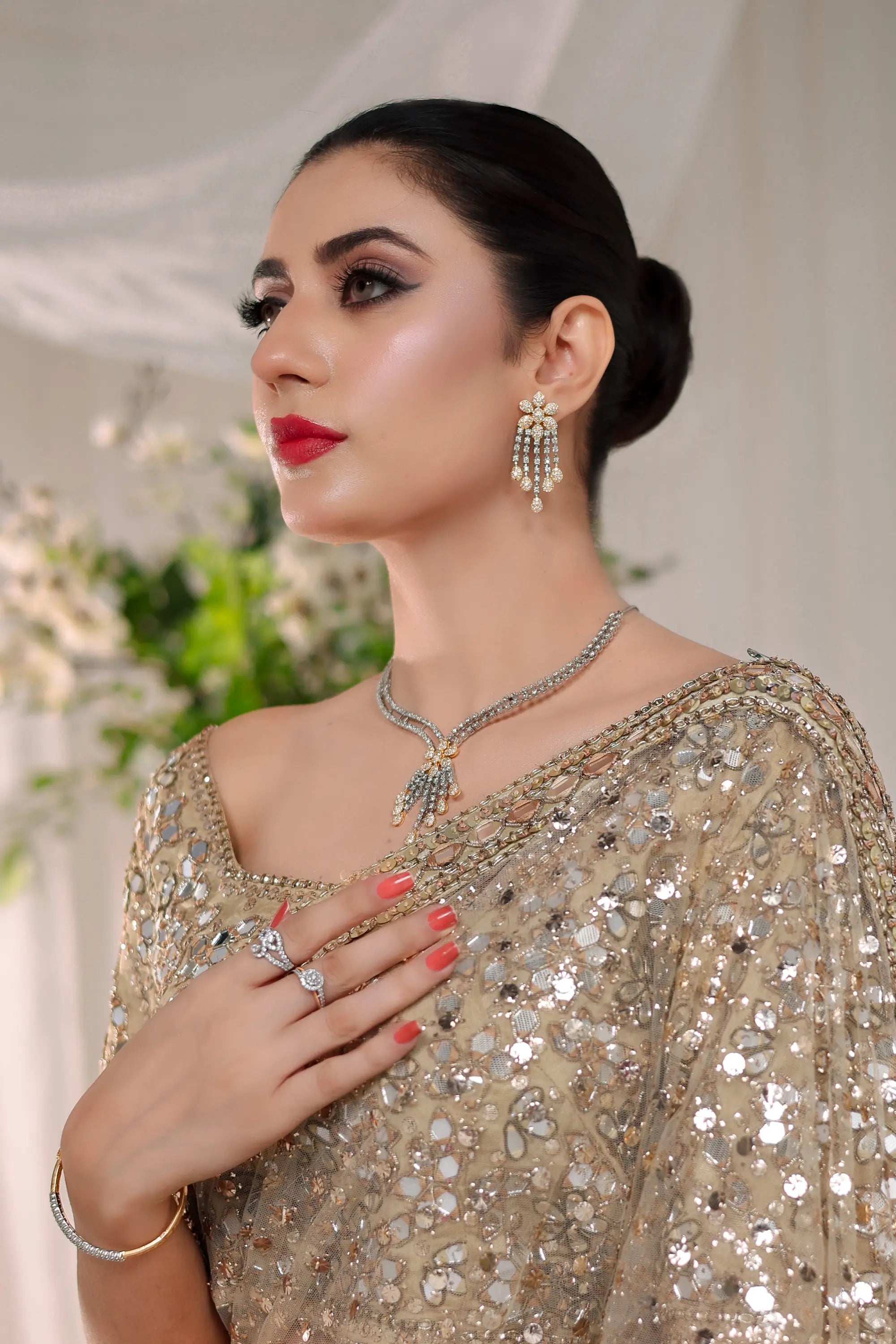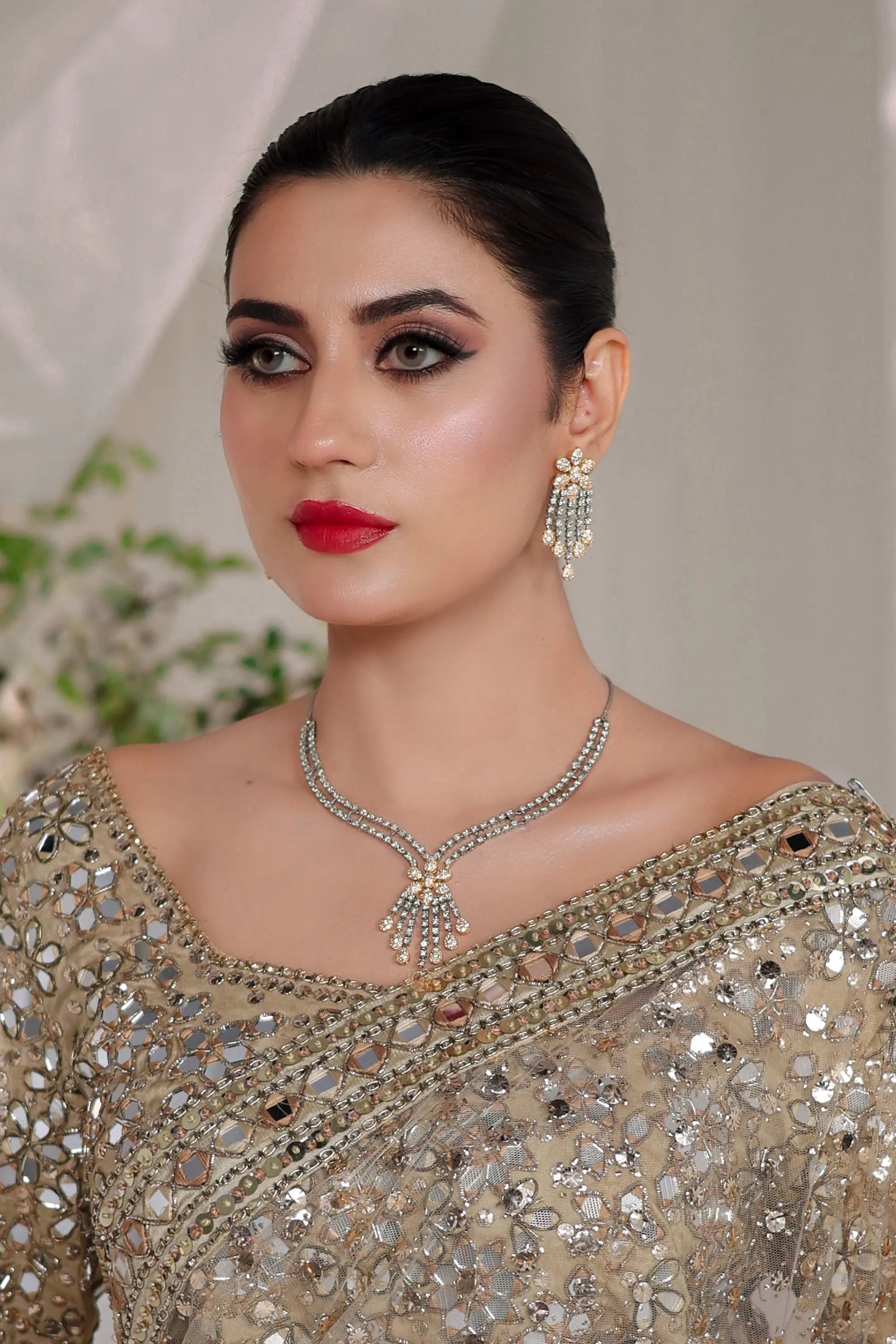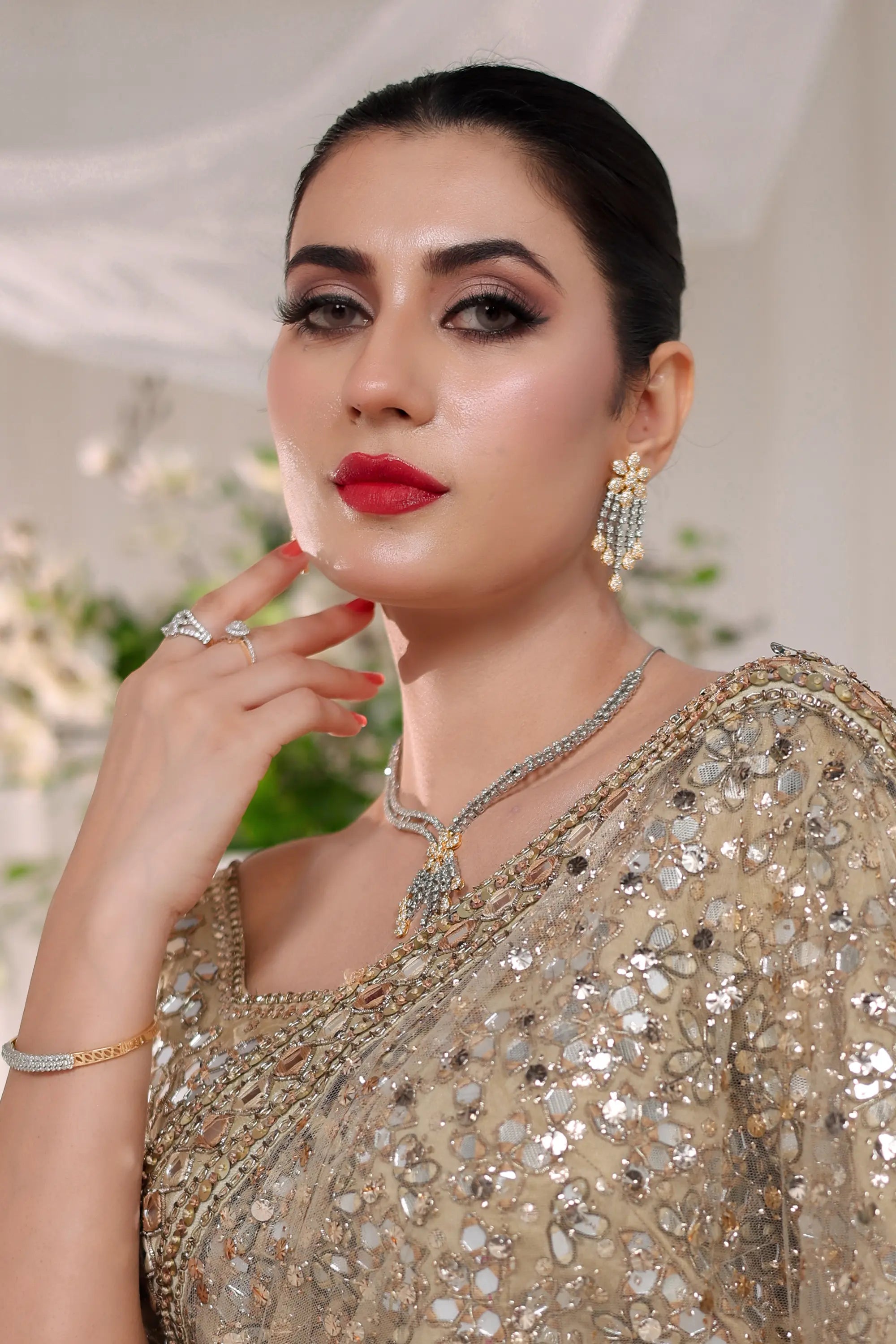 Every detail reflects balance and beauty: the refined necklace, elegant earrings, and delicately crafted rings radiate charm for both modern and traditional ensembles. Whether for bridal celebrations or evening elegance, Serena captures the timeless allure of Pakistani craftsmanship with a global touch.